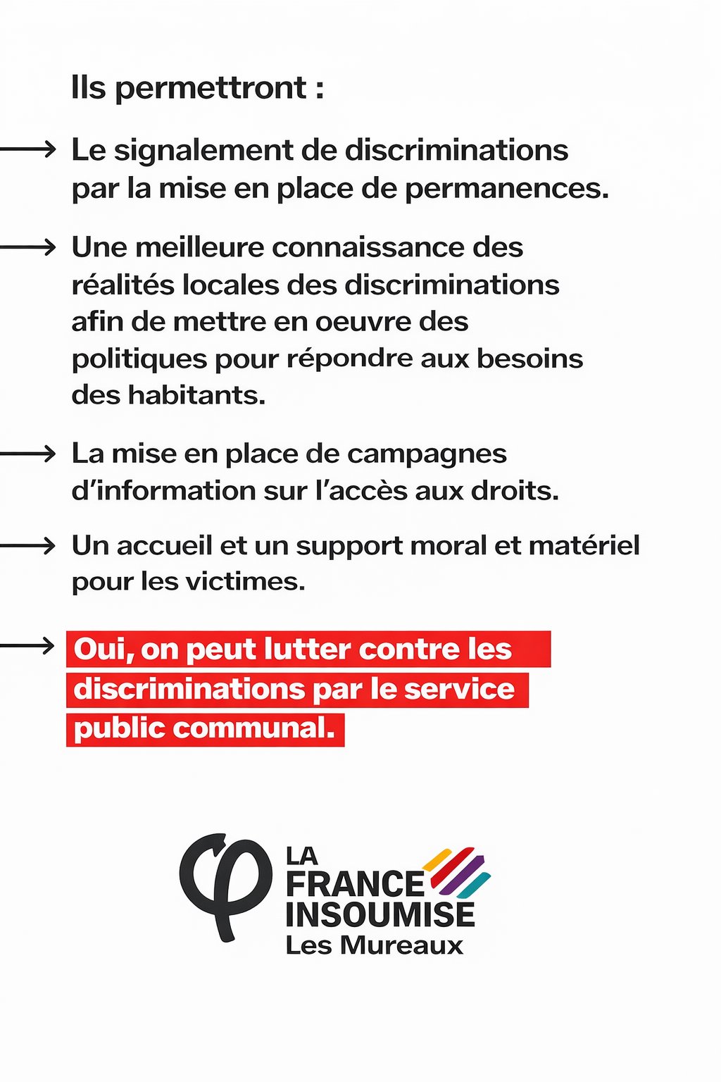 - Fournir une aide juridique et matérielle aux victimes de discriminations, grâce à des offices municipaux dédiés
